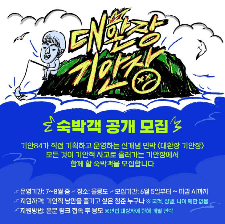 기안장은 6월 5일부터 숙박객 모집을 시작했습니다. 신비의 섬 울릉도에서 기안적 낭만을 즐기고 싶은 청춘이라면 누구나 지원이 가능합니다. 국적, 성별, 나이 상관없이 누구나 신청 가능하고, 기안84가 직접 기획하고 운영하는, 모든 것이 기안적 사고로 흘러가는 기안장의 숙박객으로 지원할 수 있습니다.